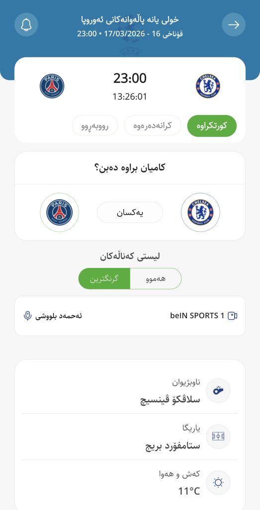 وابڕیارە ئەمڕۆ سێشەممە كاتژمێر 23:00 بەكاتی هەولێر چێڵسی لە یاریگای ستامفۆرد بریجی تایبەت بە خۆی میوانداری پاریس سانجێرمان بكات، لە میانی یاریی گەڕانەوەی قۆناخی شازدەی چامپیۆنزلیگ.