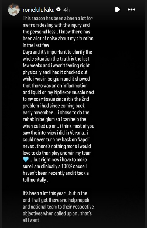 تەنیا رۆژێک پێش دەستپێکردنەوەی راهێنانەکانی ناپۆلی دوای پشووی یارییە نێودەوڵەتییەکان و پێش یارییەکەیان بەرامبەر میلان، رۆمێلو لوکاکو بێدەنگی چەند رۆژەی شکاند تاوەکوو لە تۆڕی کۆمەڵایەتی روونکردنەوە بۆ هاندەران بدات.