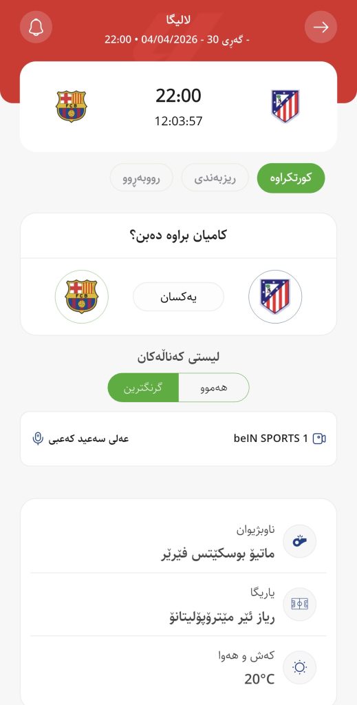 وابڕیارە ئەمڕۆ شەممە كاتژمێر 22:00 بە كاتی هەولێر ئاتلێتیكۆ مەدرید لە یاریگای ریاز ئێر مێترۆپۆلیتانۆ میوانداری بارسێلۆنا بكات، لە میانی یارییەكانی گەڕی 30 لالیگای ئیسپانیا.