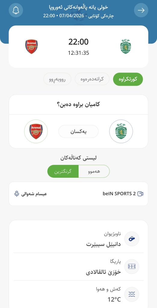 وابڕیارە ئەمڕۆ سێشەممە كاتژمێر 22:00 بەكاتی هەولێر سپۆرتینگ لە یاریگای خۆیدا میوانداری ئارسیناڵ بكات، لە میانی یارییەكانی قۆناخی چارەكی كۆتایی چامپیۆنزلیگ.