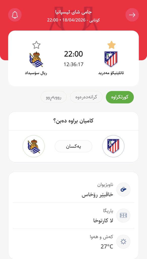 وابڕیارە ئەمڕۆ شەممە كاتژمێر 22:00 بەكاتی هەولێر ئاتلێتیكۆ مەدرید و ریال سۆسیداد لە یاریگای لا كارتوخا لە سێڤییا لە میانی یاریی كۆتایی جامی شای ئیسپانیا رووبەڕووی یەک ببنەوە.