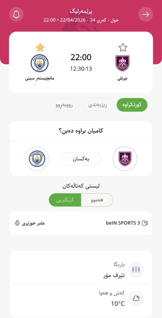 وابڕیارە ئەمڕۆ چوارشەممە كاتژمێر 22:00 بەكاتی هەولێر بێرنلی لە یاریگای خۆیدا میوانداری مانچێستەر سیتی بكات، لە میانی یارییەكانی پێشخراوەی گەڕی 34 پرێمەرلیگ.