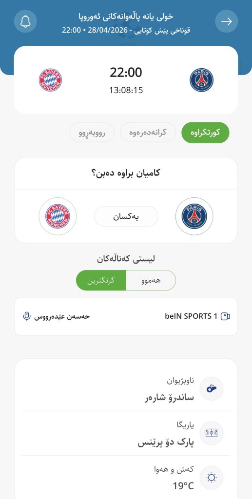 ئەمڕۆ لە یاریی لووتكەی قۆناخی پێشكۆتایی چامپیۆنزلیگ پاریس سانجێرمان لە یاریگای خۆیدا میوانداری بایرن میونشن دەكات.