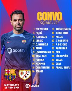 چاڤی هێرناندێزی ئیسپانی و ڕاهێنەری یانەی بارسێلۆنای ئیسپانی لیستی یاریزانە بانگهێشتكراوەكانی یانەكەی بۆ یاریەكەیان بەرامبەر ڕایۆ ڤالیكانۆ بڵاوكردەوە.